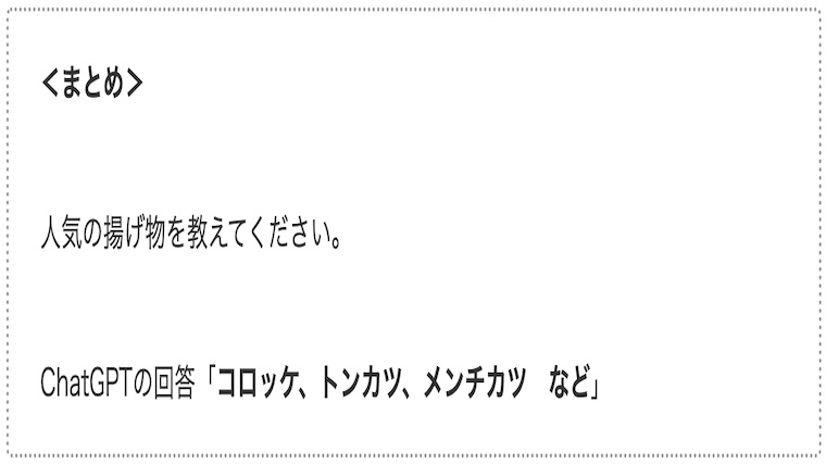 ChatGPTの回答「コロッケ、トンカツ、メンチカツ など」